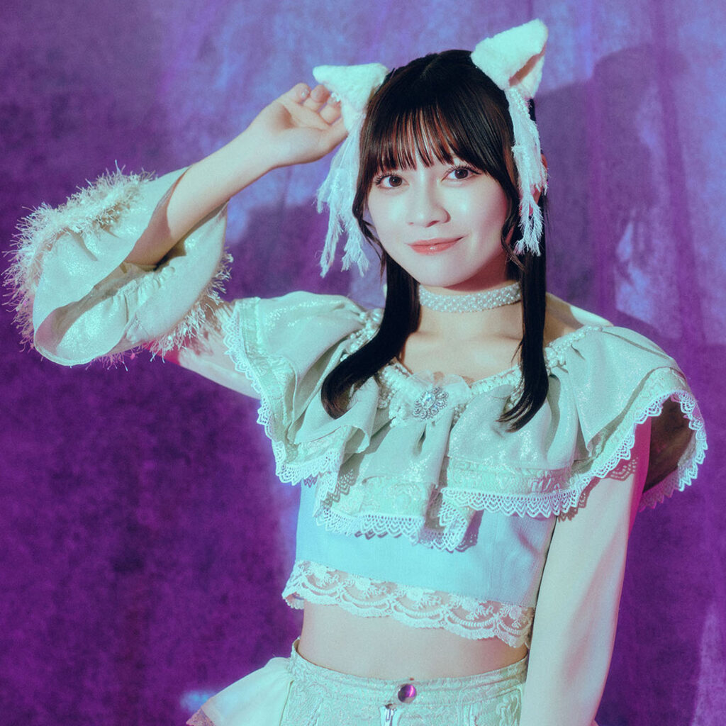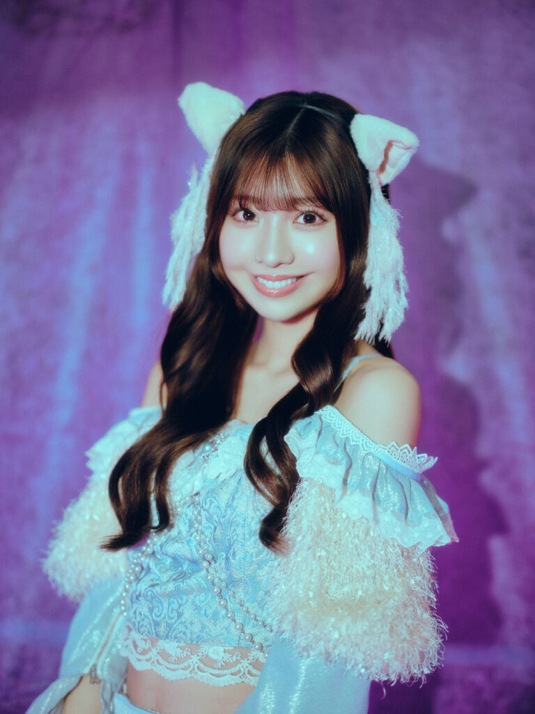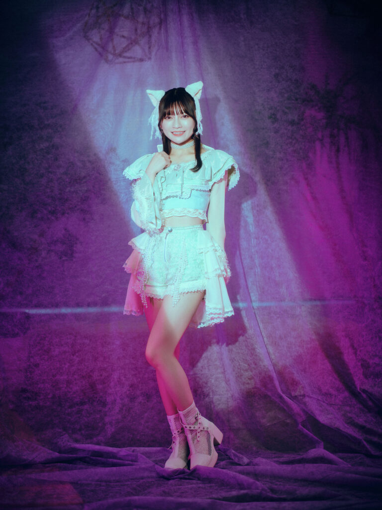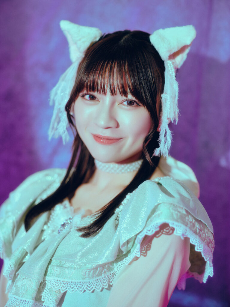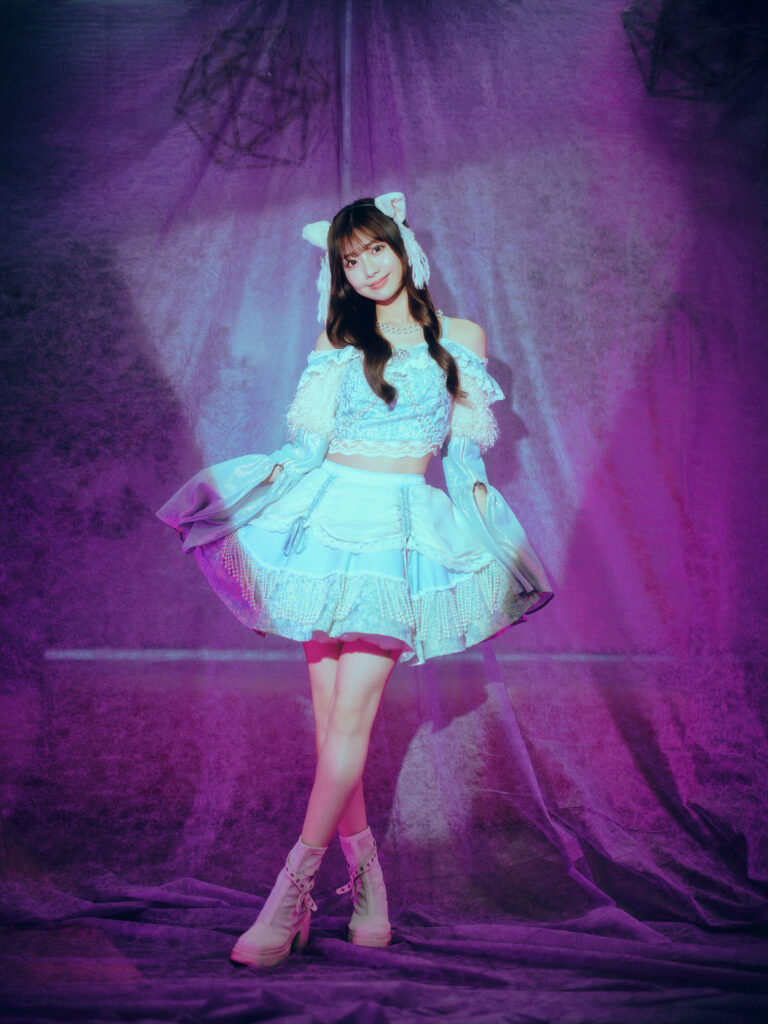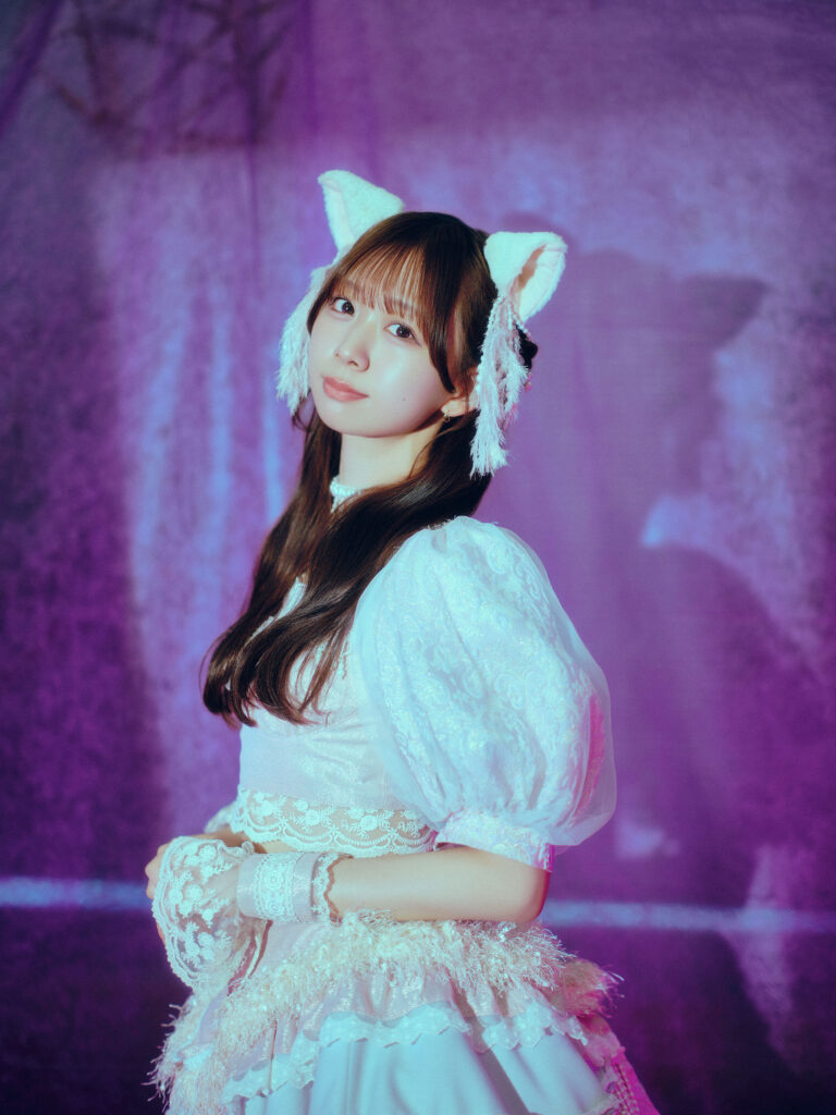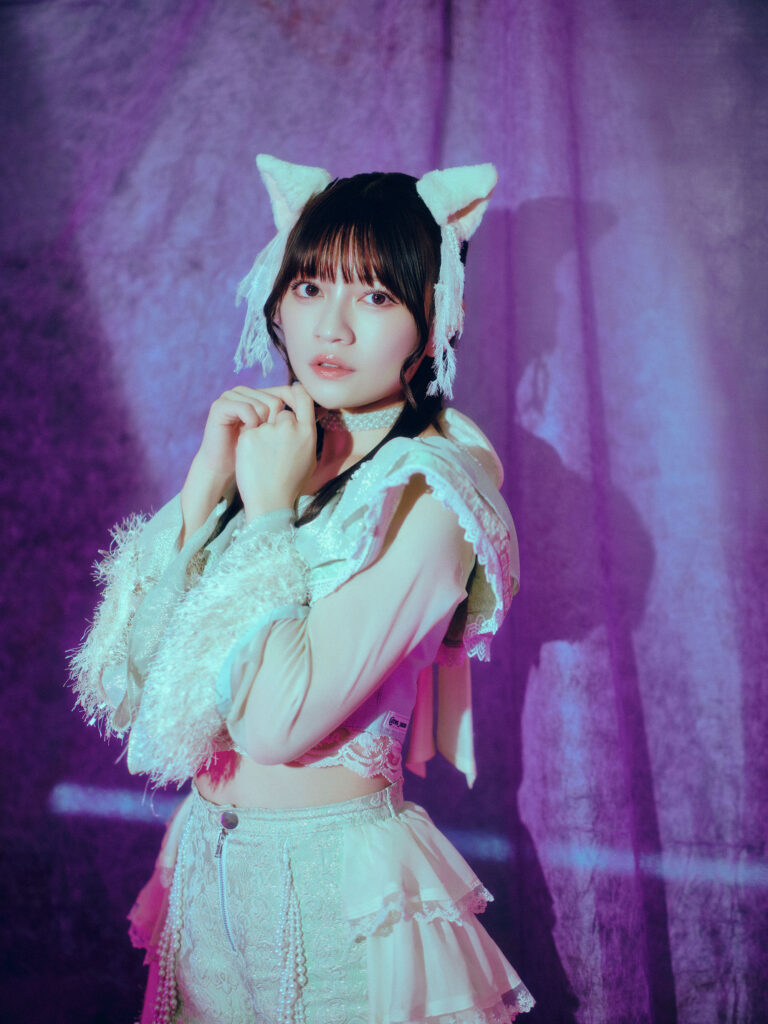 松田:この耳から下がった耳毛がとても好きなんです♡ 猫耳は10年ずっとトレードマークとして付けて来ているんです。耳の形や大きさについて、メンバーが要望することがあって、こだわりをもっています。今回、珍しい装飾が付いているのが、個人的にはテンション上がるポイントでした。パールが付いて、上品な感じも高貴な猫っぽくて大好きです。衣装もポップではなくキレイめな感じで、姫っぽさがあって嬉しいです。