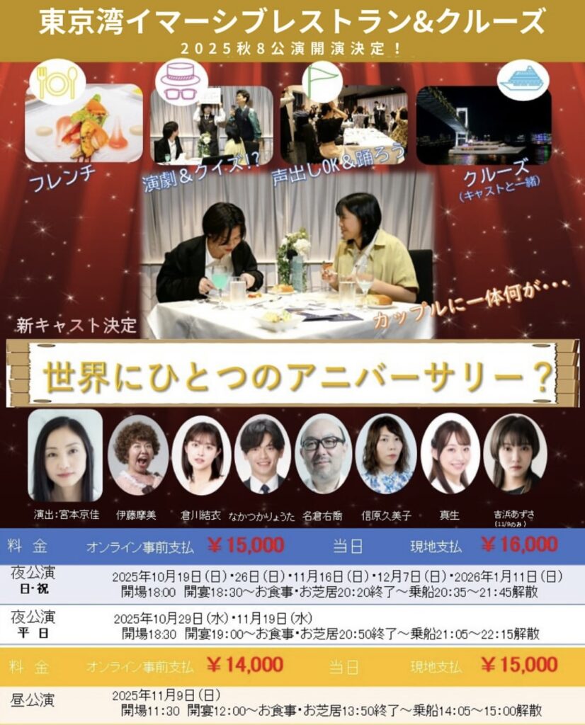 東京湾「ザ・クルーズクラブ東京」での食事を楽しめる「演劇ごはん」が10月19日(日)から2026年1月11日(日)までの間、全8回行われます。今回、ヒロイン役を演じる俳優・倉川結衣さんに出演の思いや、役者を目指すきっかけについてインタビューさせてもらいました。インタビューも終始、気負いがなく自然体で話してくれる倉川さんにとって、新たな挑戦となる今回の出演。観客を目の前に、どんな芝居で楽しませてくれるのか、貴重な機会を逃さないように足を運んでみましょう。