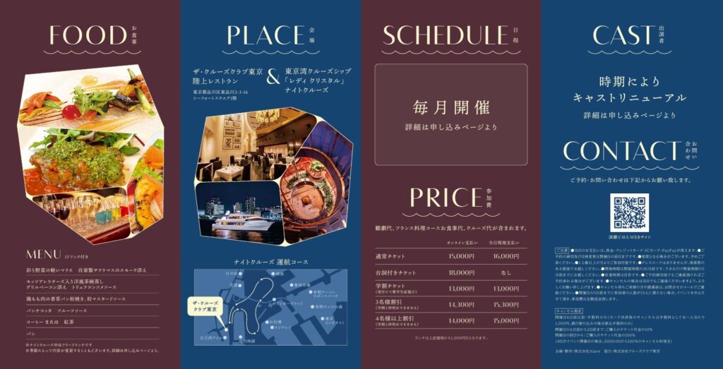 お芝居を見に行くだけではなく、お店自体がまずは素敵です。美味しい料理がありますし、キレイな景色を見ながらぼ素敵なクルーズがあり、その上でお芝居を楽しんでいただく時間を過ごせると思います。